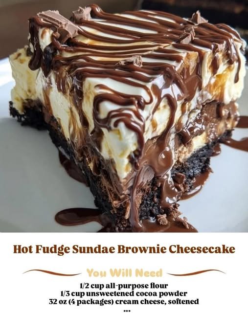 Hot Fudge Sundae Brownie Cheesecake is the ultimate dessert for chocolate lovers. It combines three all-time favorites into one unforgettable treat: a fudgy brownie base, a creamy cheesecake center, and a glossy hot fudge topping finished with classic sundae garnishes. Every bite delivers deep chocolate flavor, silky texture, and just the right amount of sweetness, making it perfect for birthdays, holidays, or any special occasion.