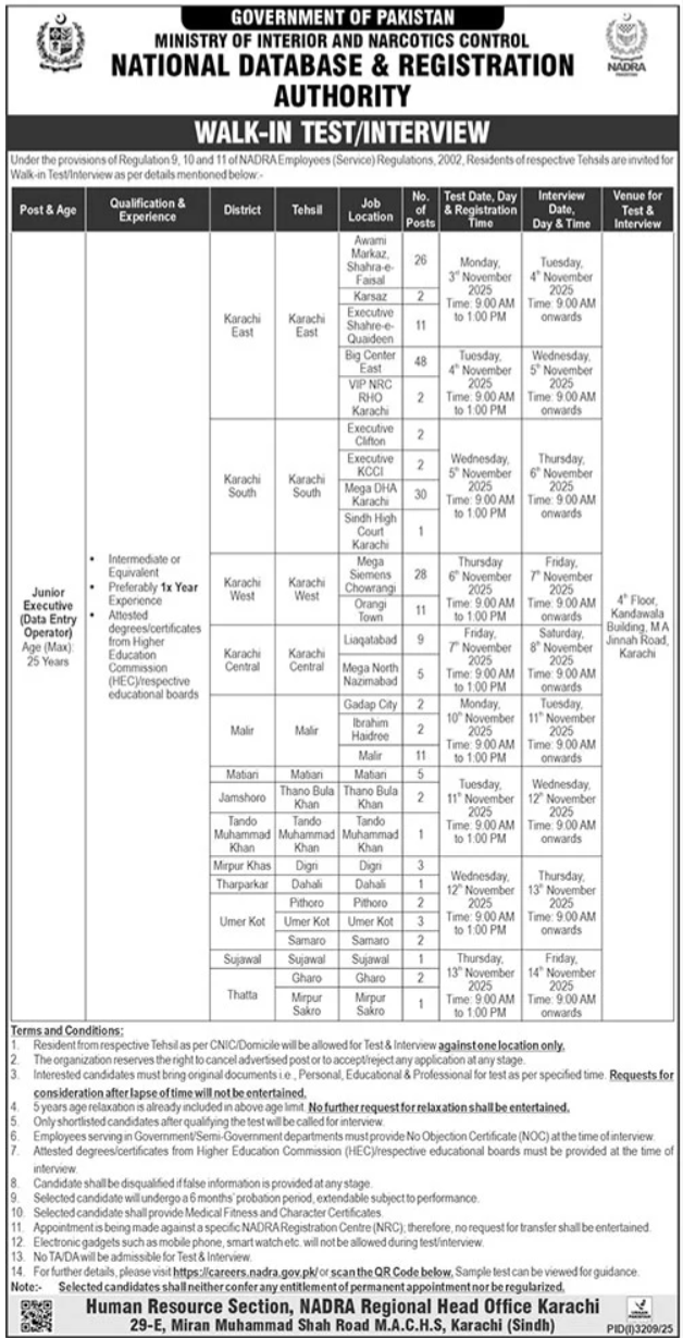 Candidates if you are seeking the NADRA Ministry of Interior and Narcotics Control Jobs In Karachi November 2025 if yes. It would be best if you tried to complete read this Ministry of Interior and Narcotics Control job because you can easily apply for these vacancies Junior Executive (Data Entry Operator) Age (Max) 25 Years Only Male candidates can apply for this NADRA Ministry of Interior and Narcotics Control Jobs In Karachi November 2025 Qualification /Experience Required: Intermediate or Equivalent Preferably 1x Year Experience Attested degrees/certificates from Higher Education Commission (HEC)/respective educational boards and more experienced candidates should apply before 05 November 2025.